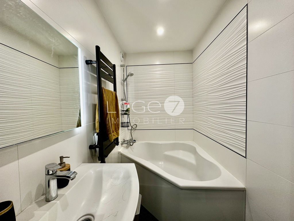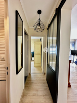 L'appartement se compose d'une cuisine ouverte sur la pièce de vie lumineuse avec un accés direct au balcon, de deux chambres équipées de rangements. Nous y retrouvons également une salle de bain avec WC séparés. Une Banderie avec machine à laver et congélateur d'appoint.