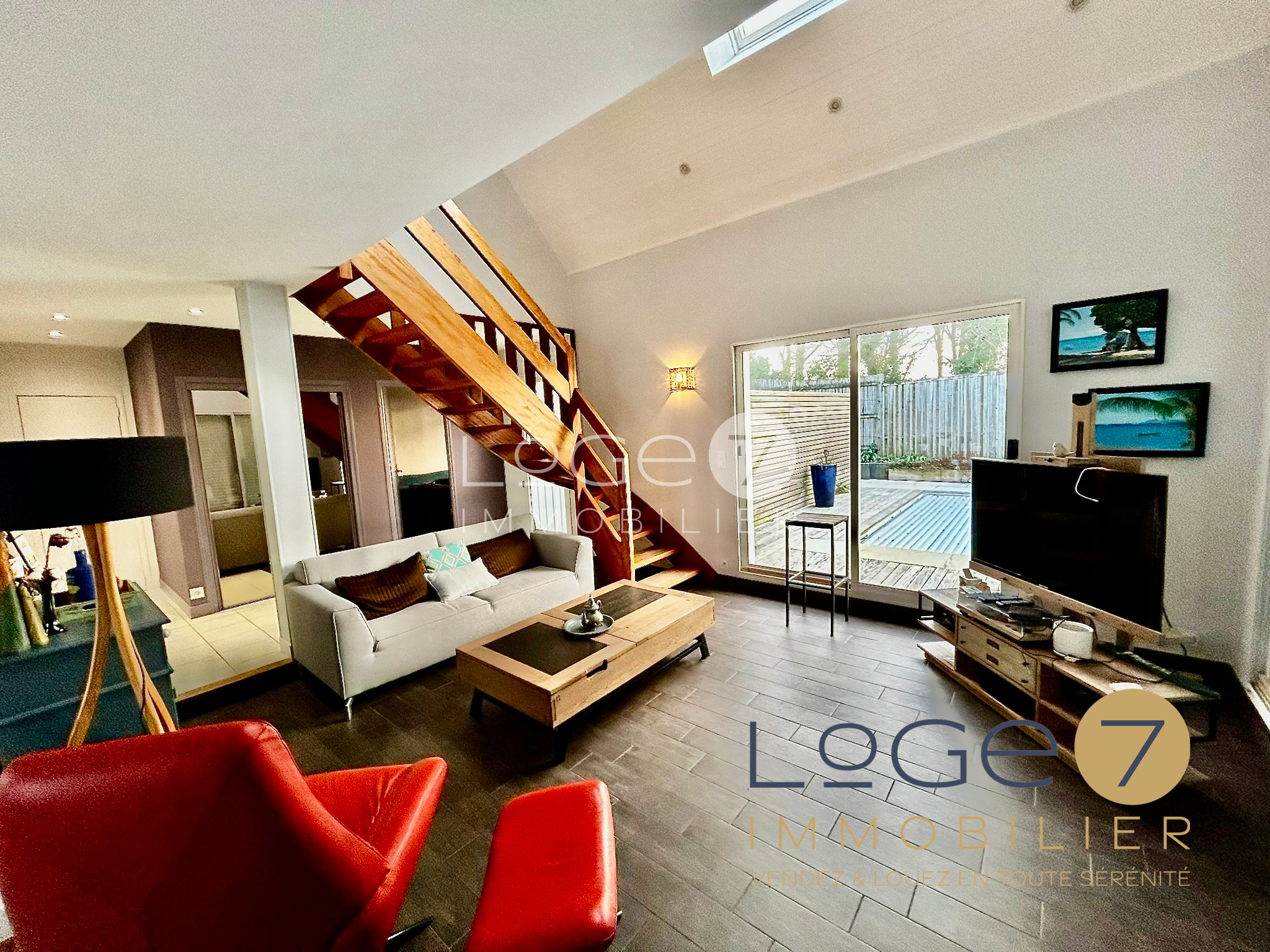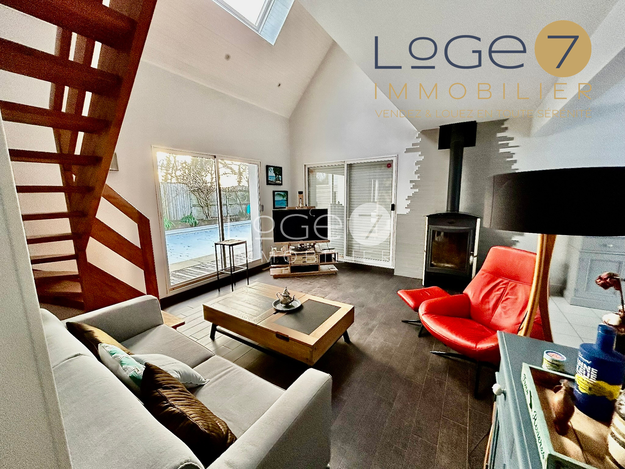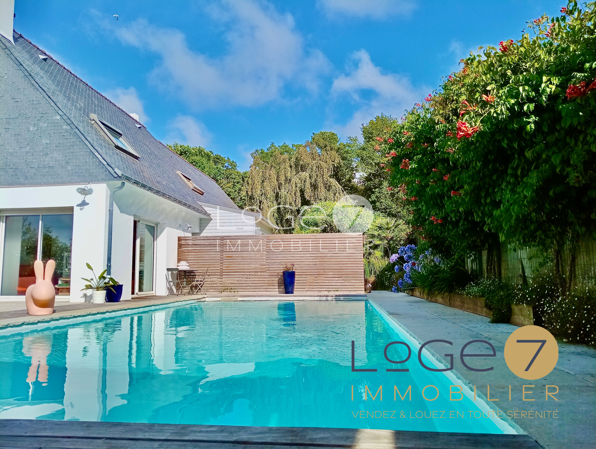 Vos agences LOGE 7 IMMOBILIER de Guidel et Clohars-Carnoët vous proposent en location à l’année cette superbe maison contemporaine de 120 m², située dans un environnement calme, à proximité du bourg de Guidel.