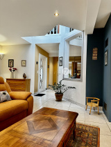 Édifiée sur un terrain arboré d’environ 1 400 m², cette maison développe 153 m² habitables et séduit dès l’entrée par son vaste séjour-salon baigné de lumière, agrémenté d’un poêle a bois grande capacité, idéal pour des moments chaleureux en famille ou entre amis. Un grand placard à l’entrée apporte un vrai confort de rangement.