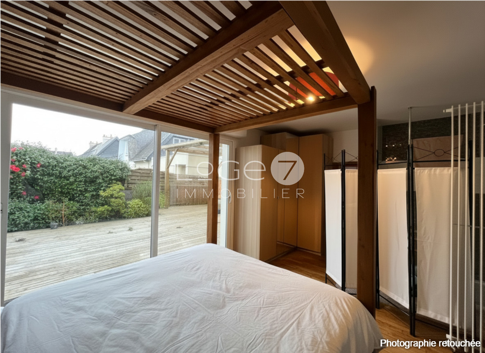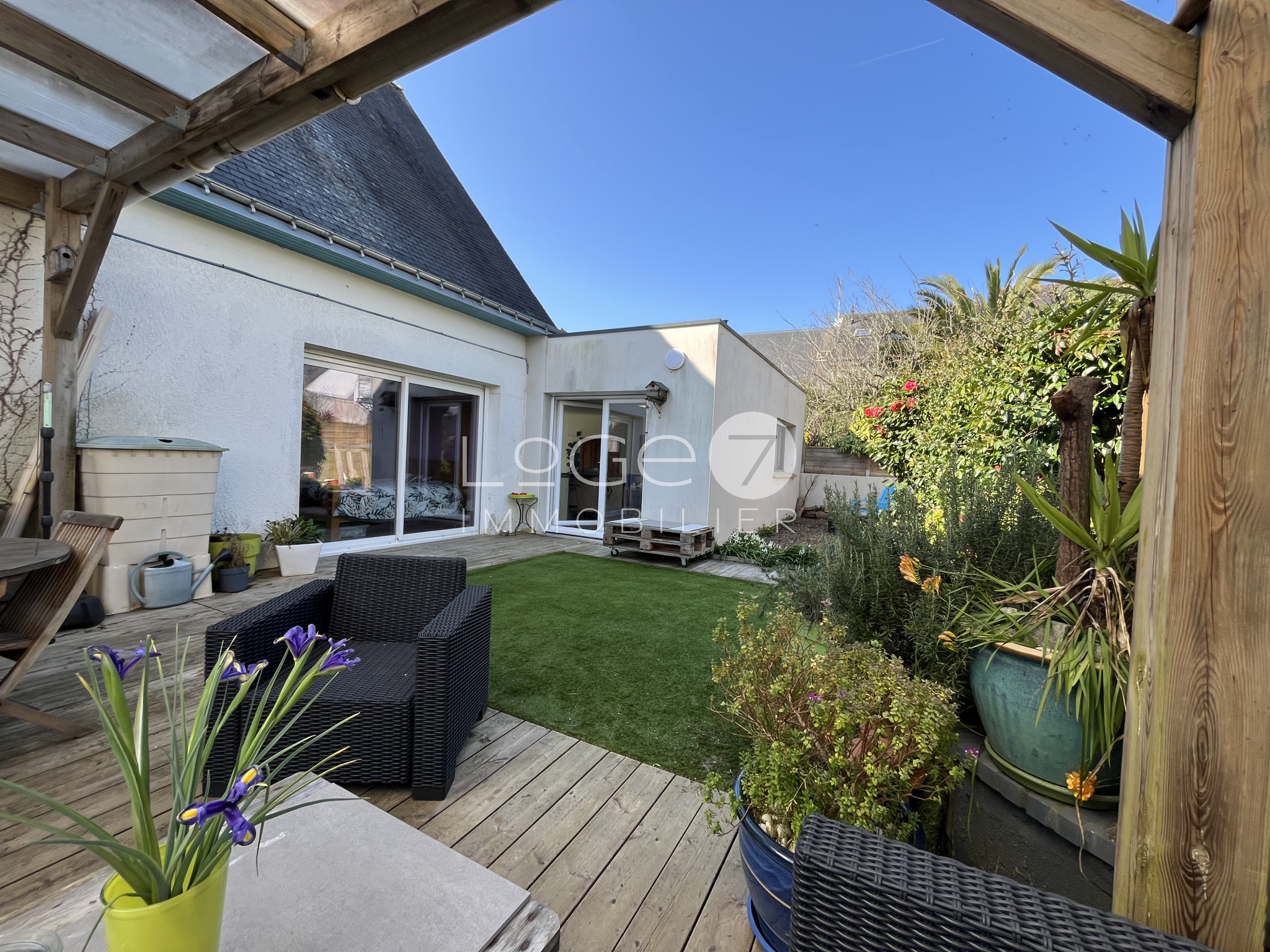A l'extérieur, vous profiterez de moments de détente avec sa pergola et sa terrasse bois intimiste.