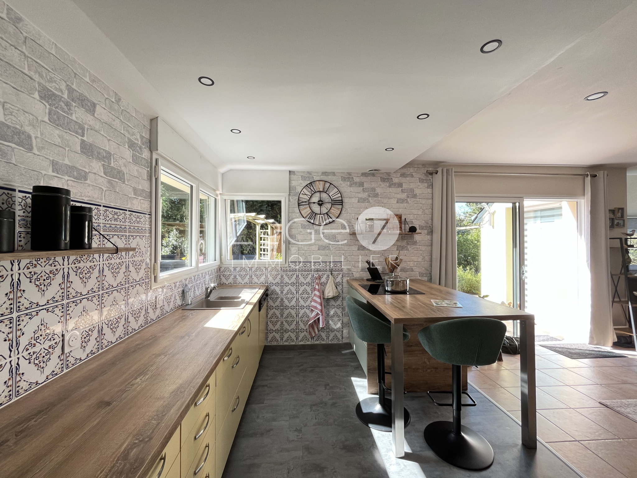 Dès l’entrée, vous découvrez une belle pièce de vie spacieuse et lumineuse composée d’un grand salon-séjour avec un poêle à granules ouvert sur une cuisine conviviale. L’ensemble offre un espace chaleureux, idéal pour profiter de réels moments de détente au quotidien.