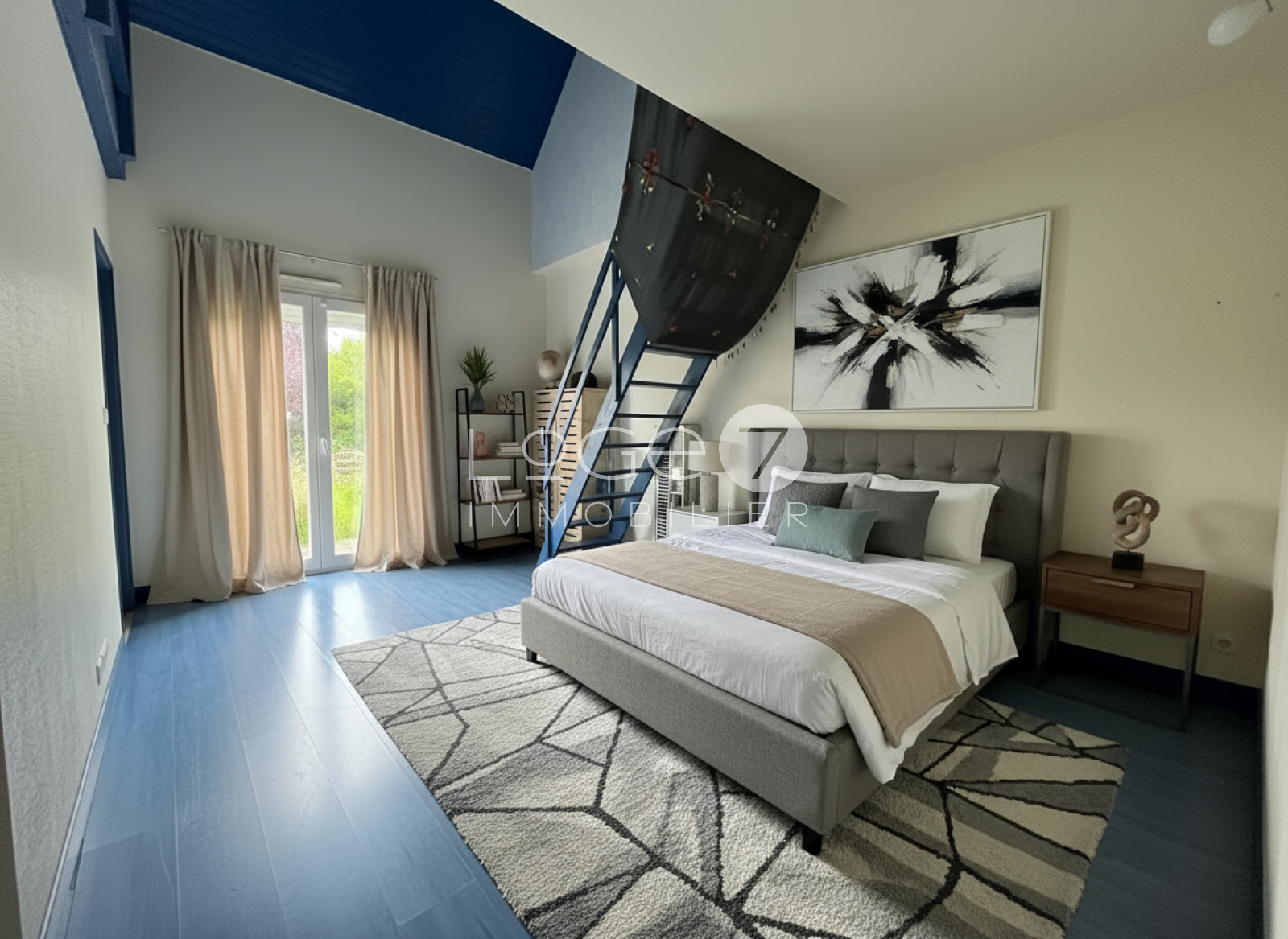 La partie nuit s’organise intelligemment avec trois chambres disposées en enfilade, chacune ayant sa porte fenêtre donnant sur le jardin, et toutes sont équipées d’une mezzanine, un atout rare qui offre un espace supplémentaire pour un coin lecture, un bureau, un rangement ou une aire de jeux pour les enfants.