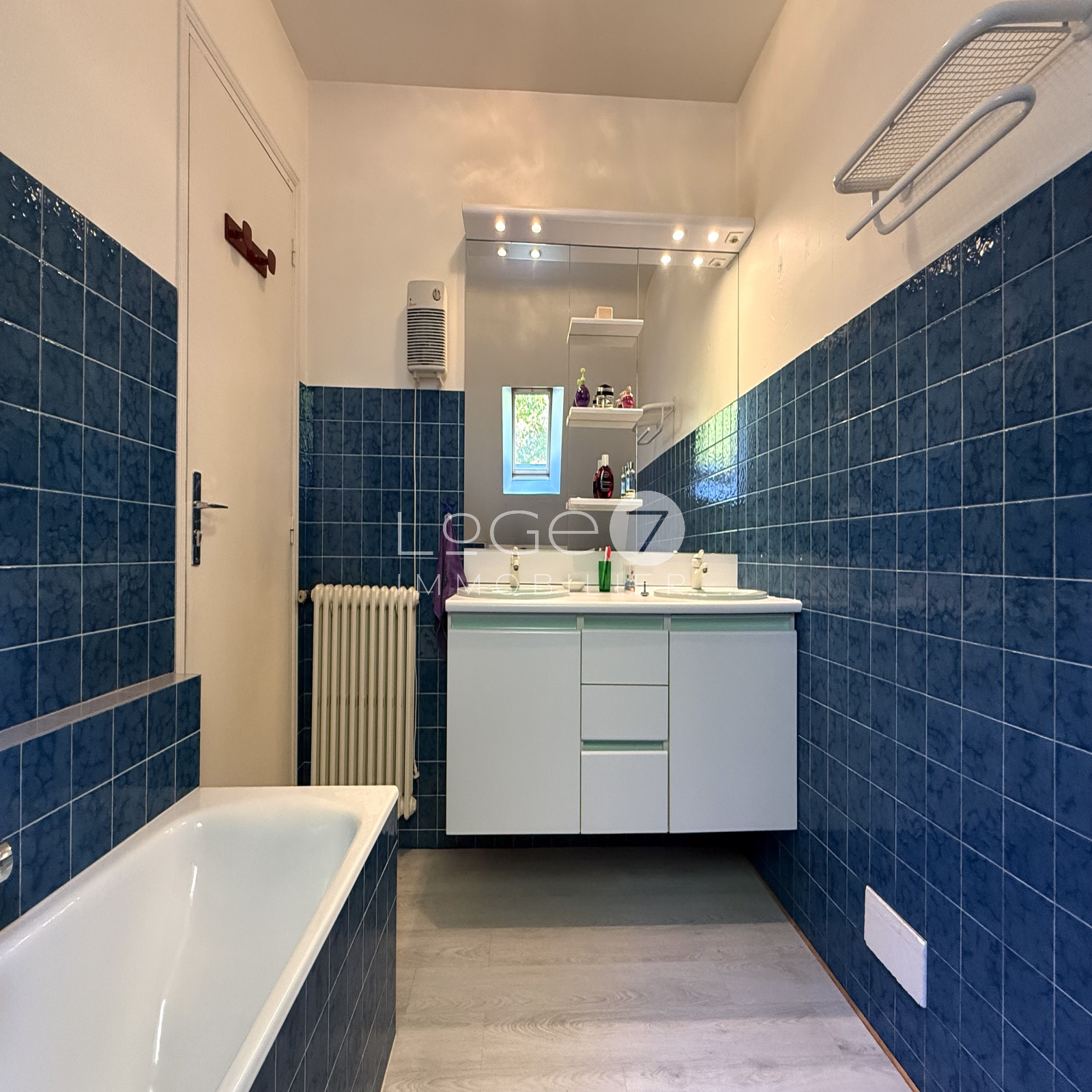 La pièce de vie de 40 m², baignée de lumière et agrémentée d’un insert, s’ouvre sur le jardin et invite à la détente comme aux moments partagés.