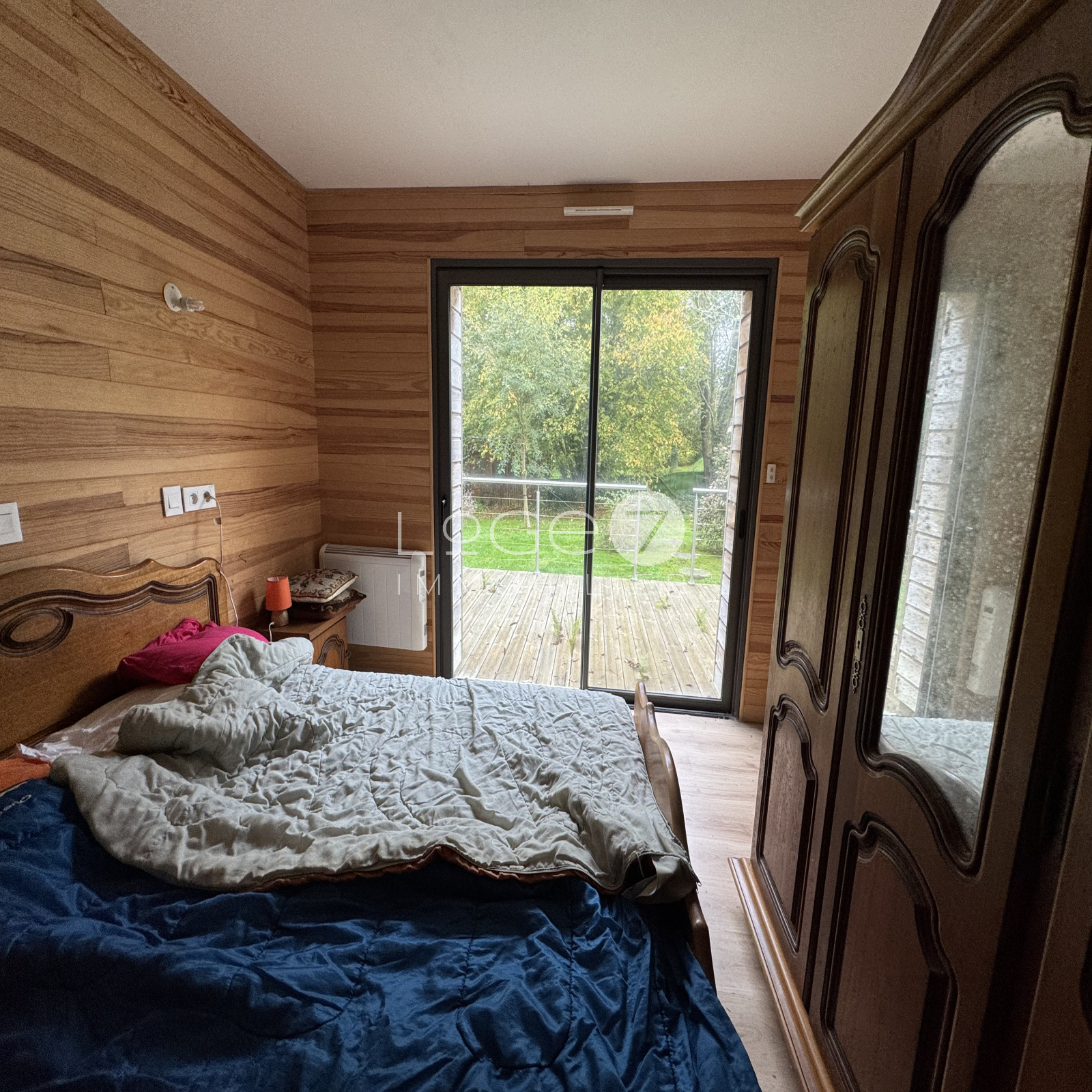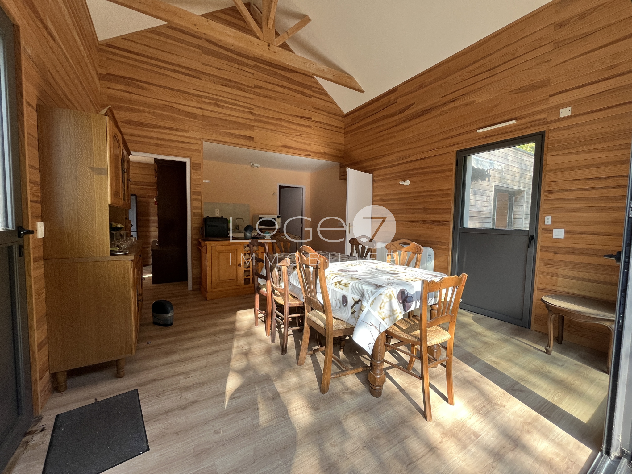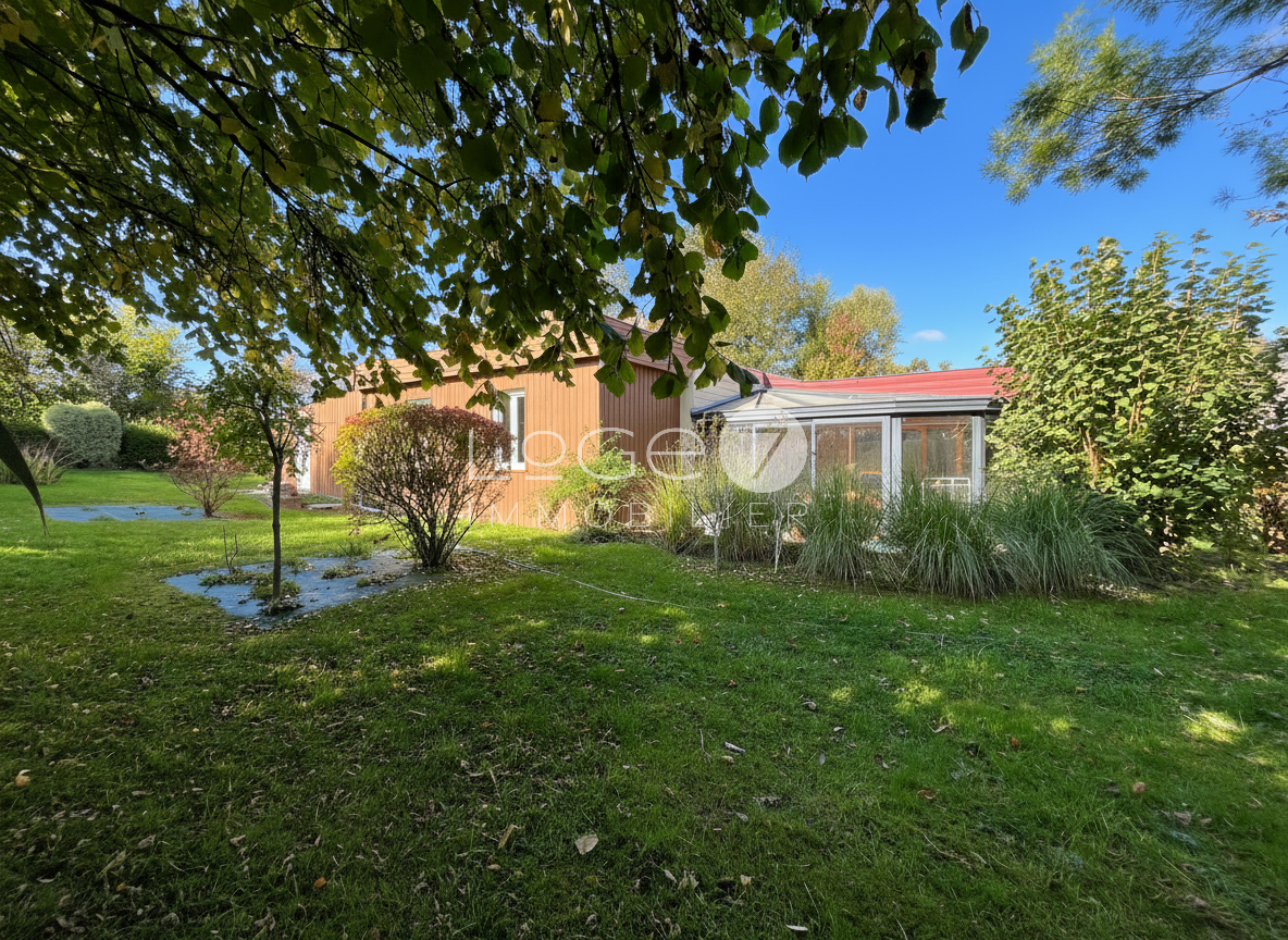 Construite en ossature bois, cette maison offre un charme naturel et une atmosphère chaleureuse. Entièrement de plain-pied, elle propose une grande pièce de vie traversante ouvrant sur une véranda lumineuse et deux terrasses exposées OUEST, parfaite pour profiter du jardin toute l’année.