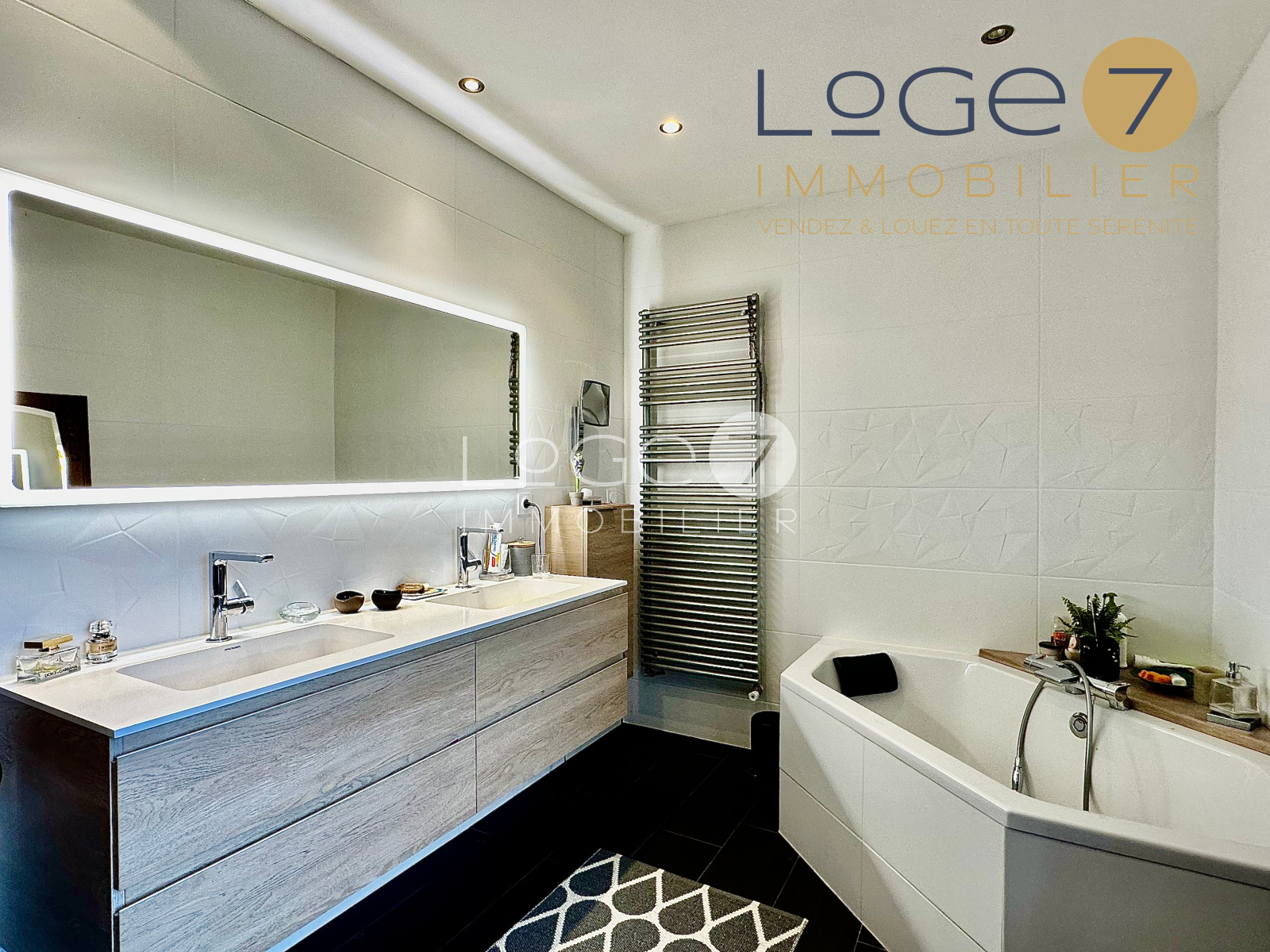 Au premier étage, se trouve un palier donnant sur un balcon et desservant deux chambres, dont une avec dressing, une spacieuse salle de bain avec baignoire et douche.